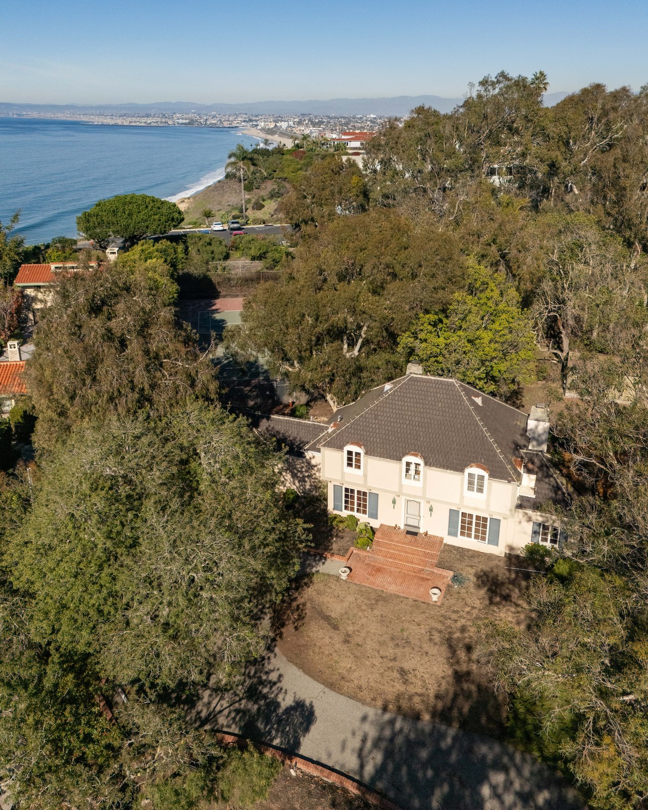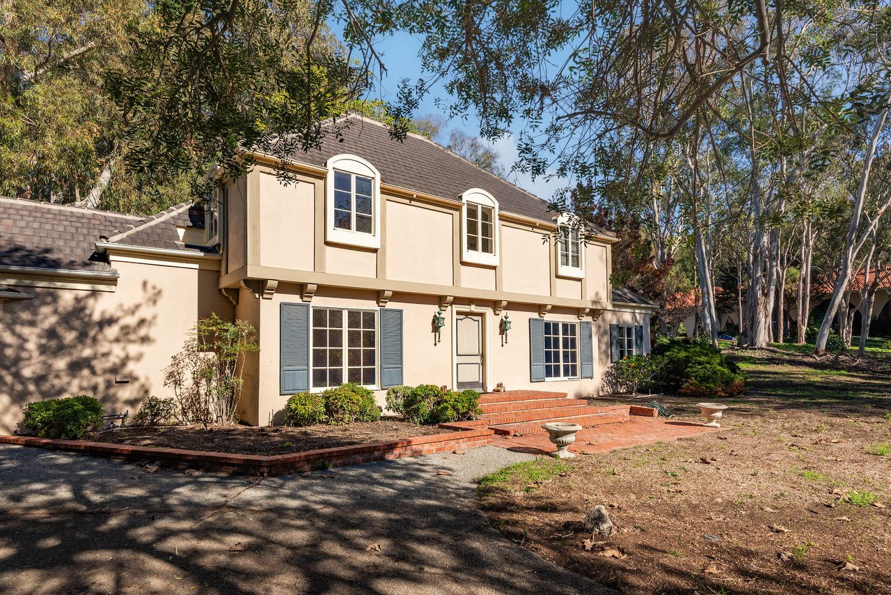Set across nearly 0.89 acres of private grounds, the estate unfolds like a forgotten European retreat, concealed behind mature landscaping and gently elevated terrain just moments from the Pacific Ocean.