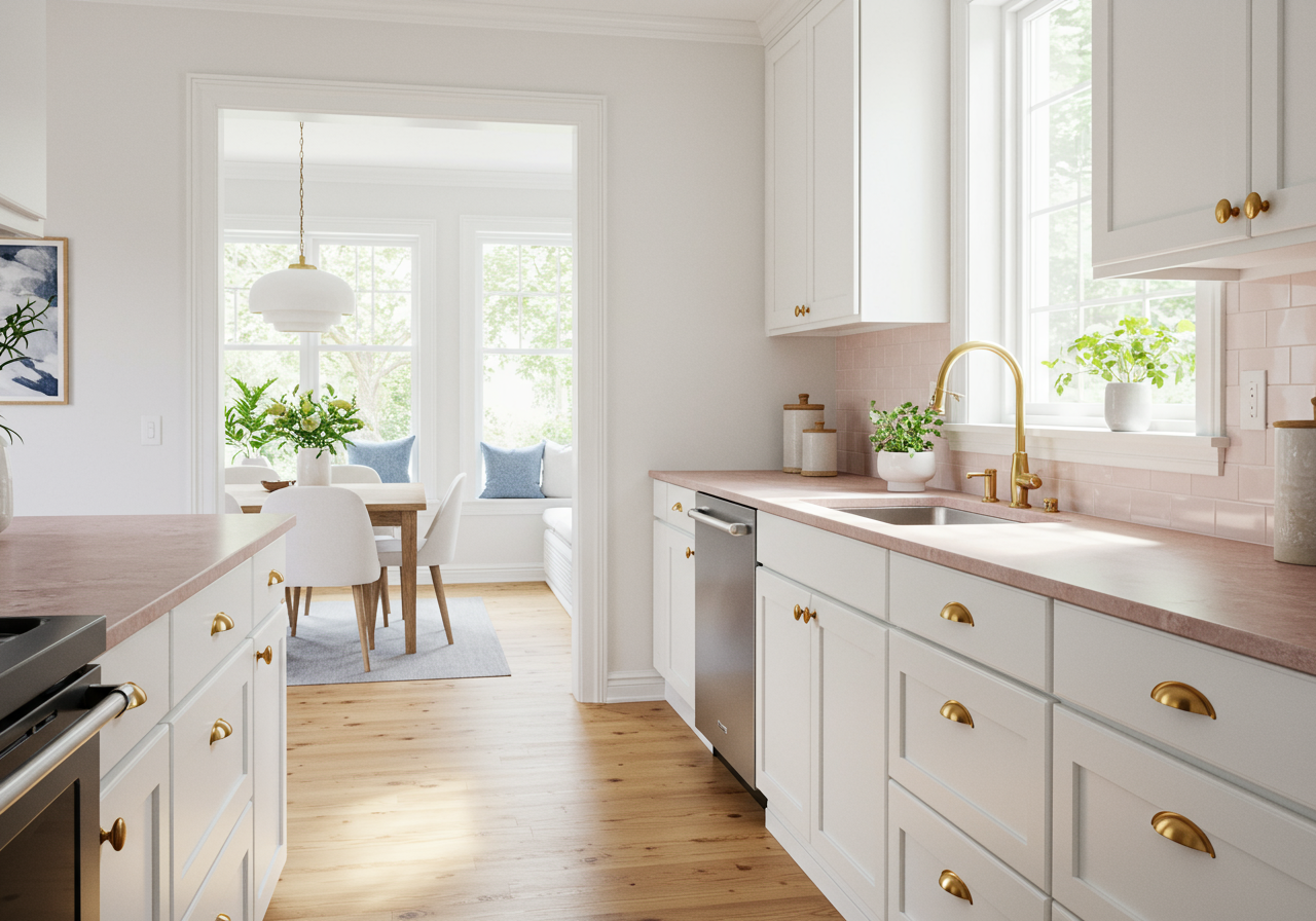 Next, we tackled the kitchen. Refinished the floors, painted and added new beautiful hardware on the cabinets, and installed a beautiful, new lighting fixture in the dining room to bring together the dining and kitchen areas.