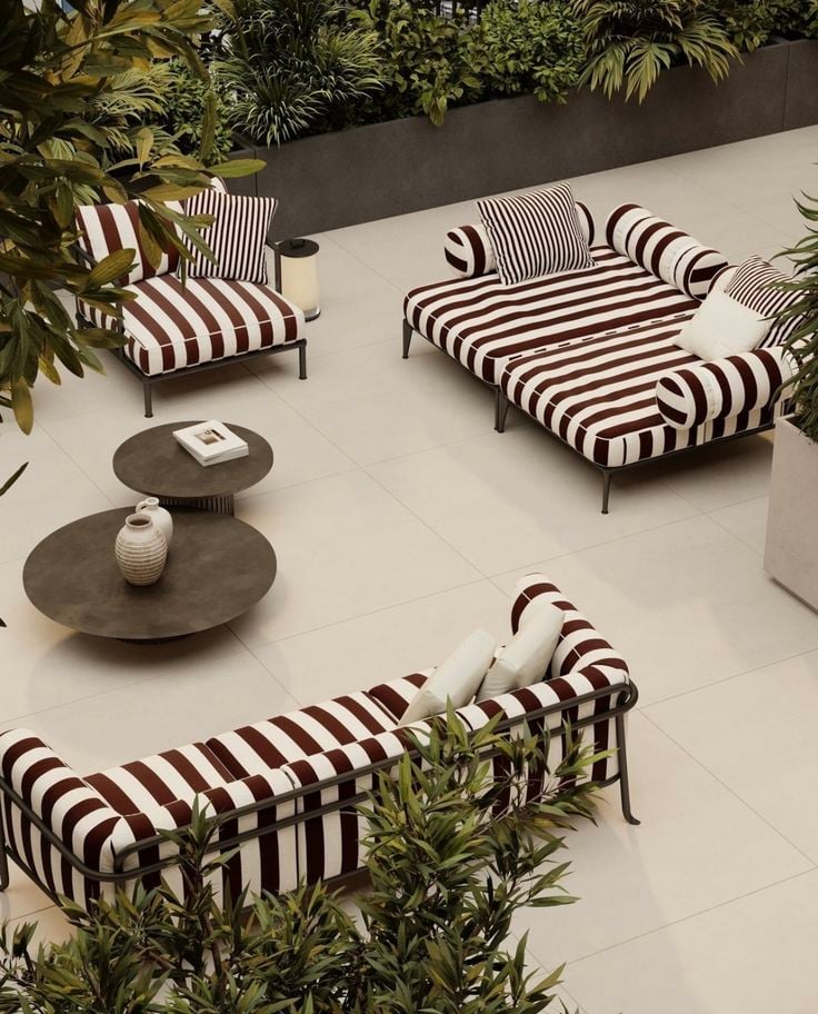 The clearest macro trend across all outdoor furniture this year is a distinctly Mediterranean sensibility: wrought iron frames, classic stripes, terracotta pots, linen tablecloths, and resort-style umbrellas. The goal is a space that feels less like a backyard and more like a destination.